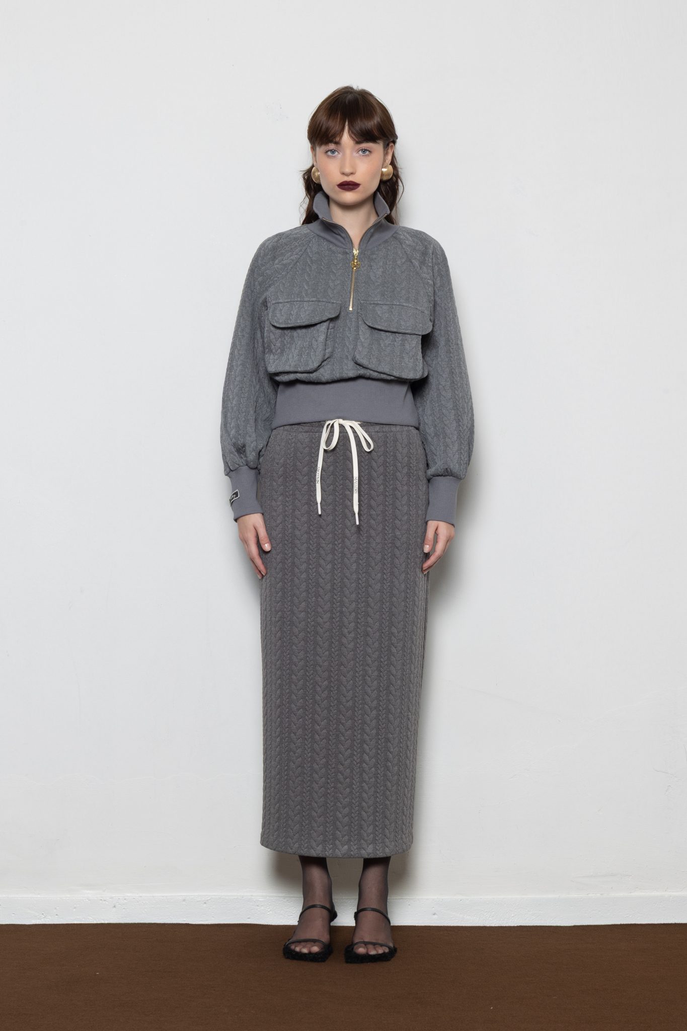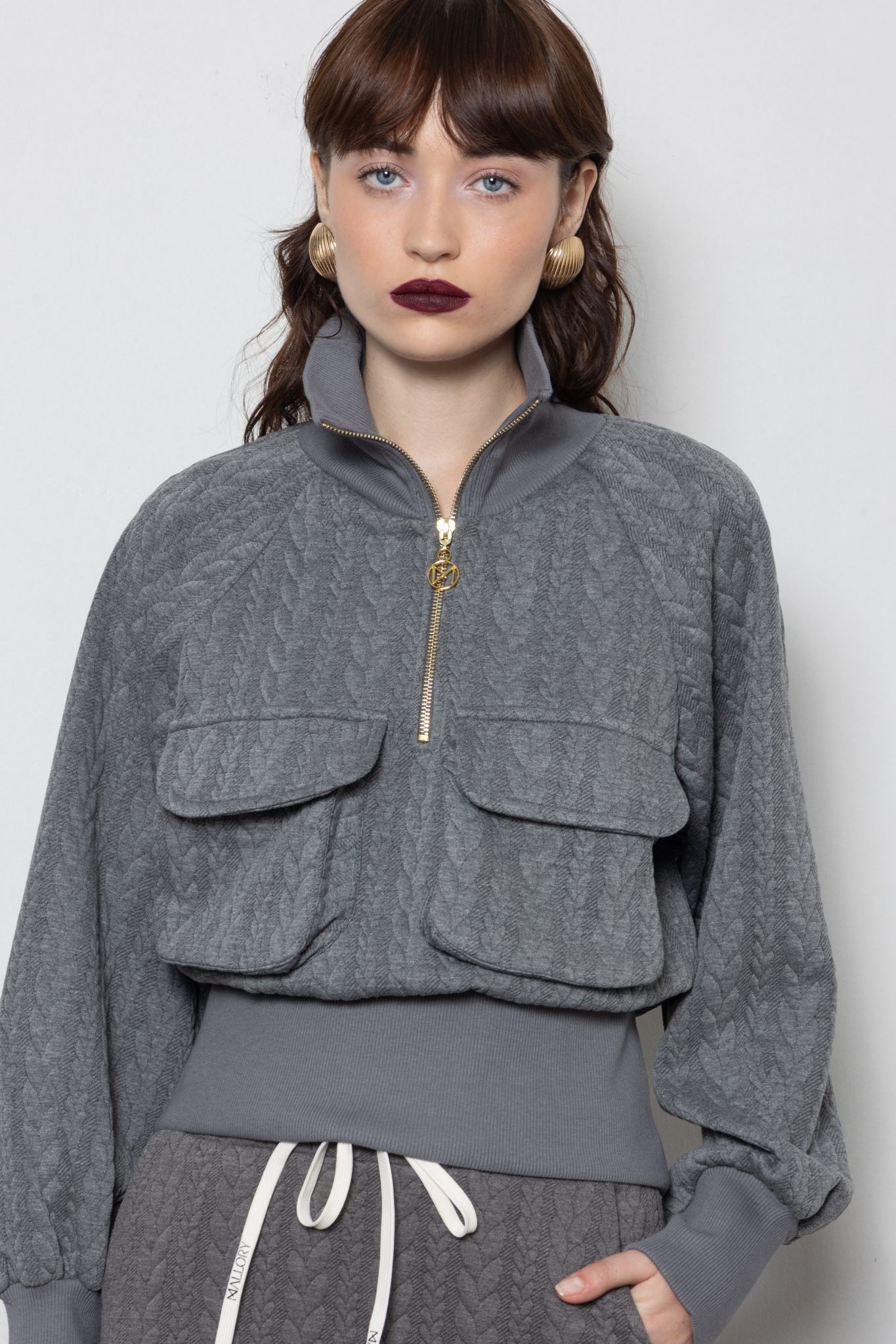 Cropped Grey sweatshirt with front utility pockets and gold zip —sporty, sleek, and effortlessly cool.