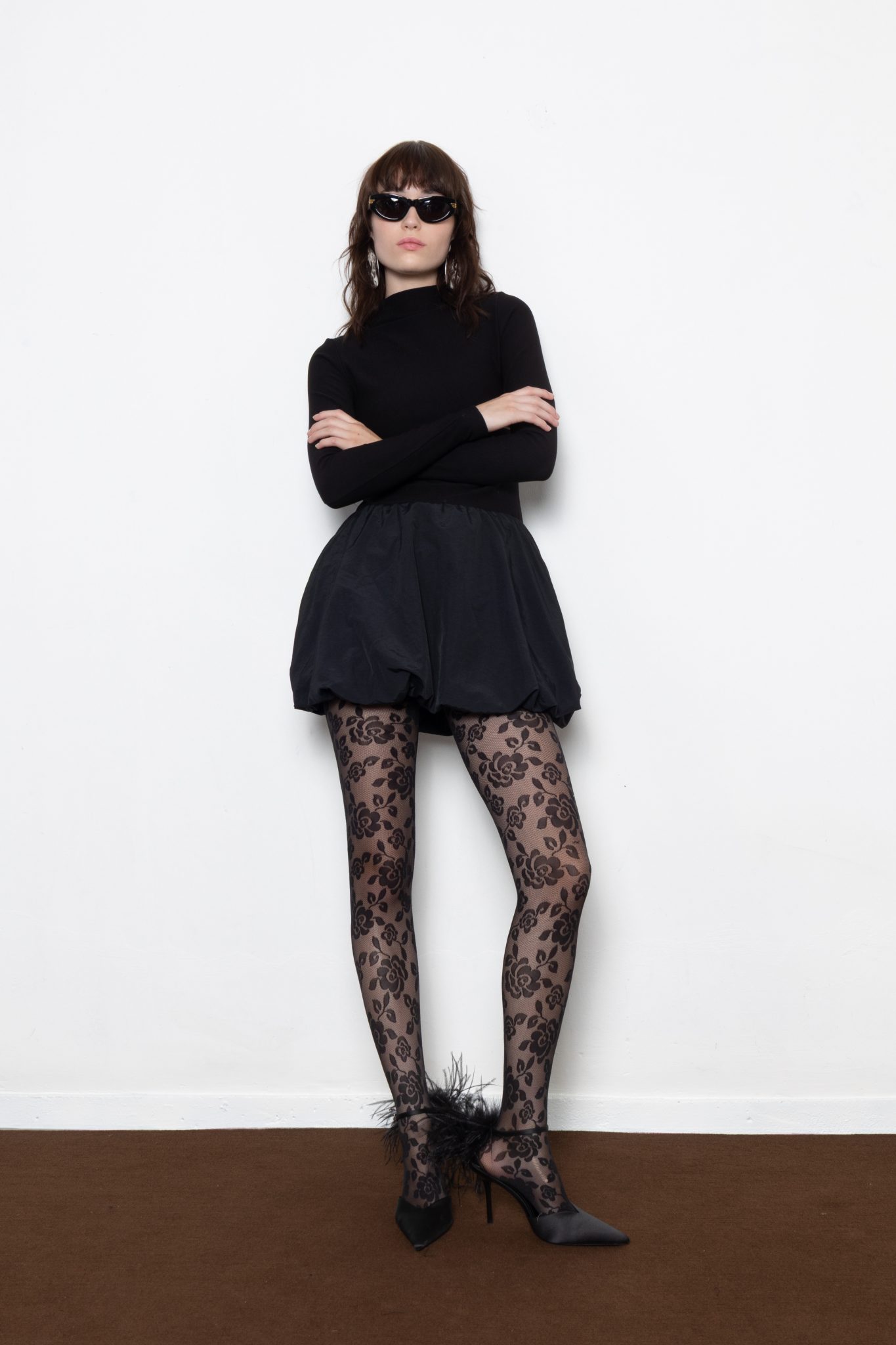 Balloon black mini dress with a high neck and structured silhouette —minimal on top, statement below.