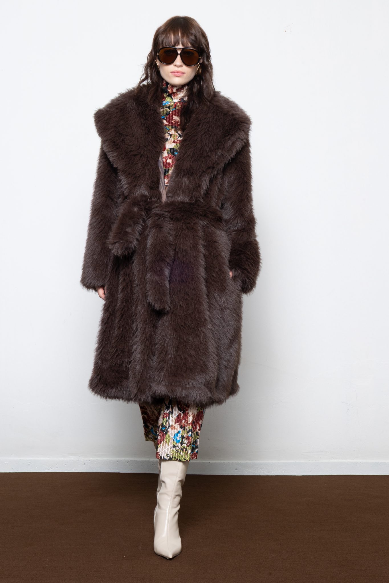 Plush faux fur coat with oversized collar and waist tie —bold, cozy, and unapologetically luxe.