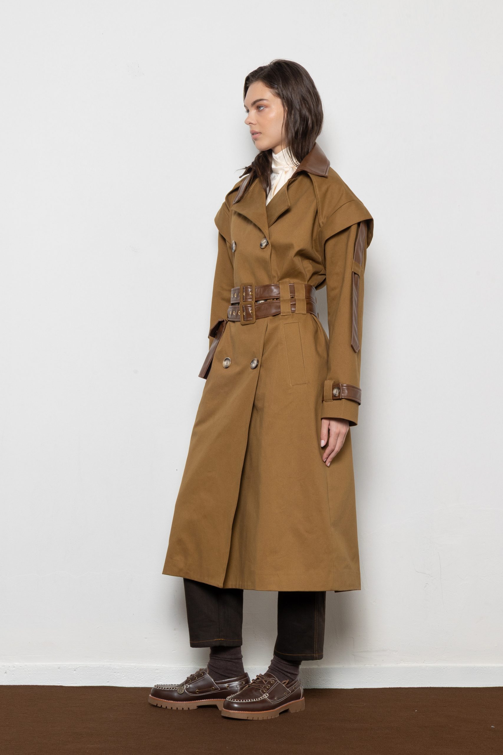 Structured trench coat with leather accents and two statement belts —utilitarian edge meets timeless sophistication.