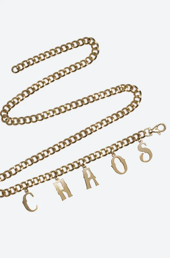 Add an edge to your look with our Chaos Belt. This adjustable chain belt is made from nickel-free iron plated chain and has brass plated letters that spell out chaos. With two colours to choose from, you can accessorise with either gold or silver.