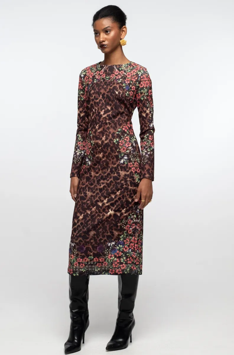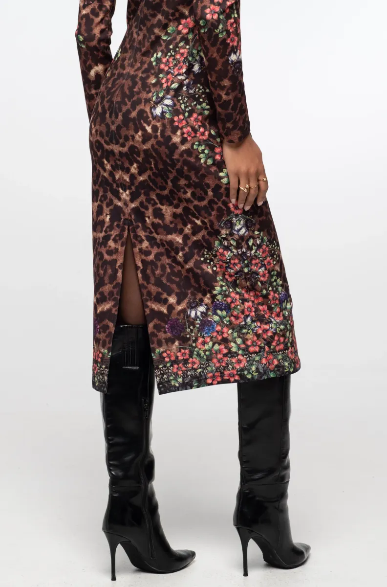 Rose-like leopard markings and climbing florals spread across our Clematis Dress with the informality of the natural world. With long sleeves and a crew neck, this stretch bodycon dress has a slit at the back for ease of movement, and a metallic Chaka detail for P+C style. Discover the exceptional print of this item, crafted using the placement technique. Each part of the garment features a unique print, and when combined, they create a true masterpiece.