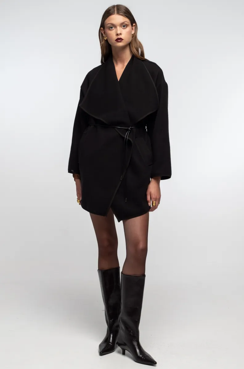 Unlined and ultra-soft, our Cocooned Wrap Coat offers effortless layering for fall. This lightweight coat has an exaggerated shawl collar and a softly cocooned silhouette with inseam pockets and a subtle metallic Chaka detail. The bound edges and inside seams maintain the refined energy while the fine eco-leather belt, finished with metallic tips, customises the fit. Available in warm brown or classic black.