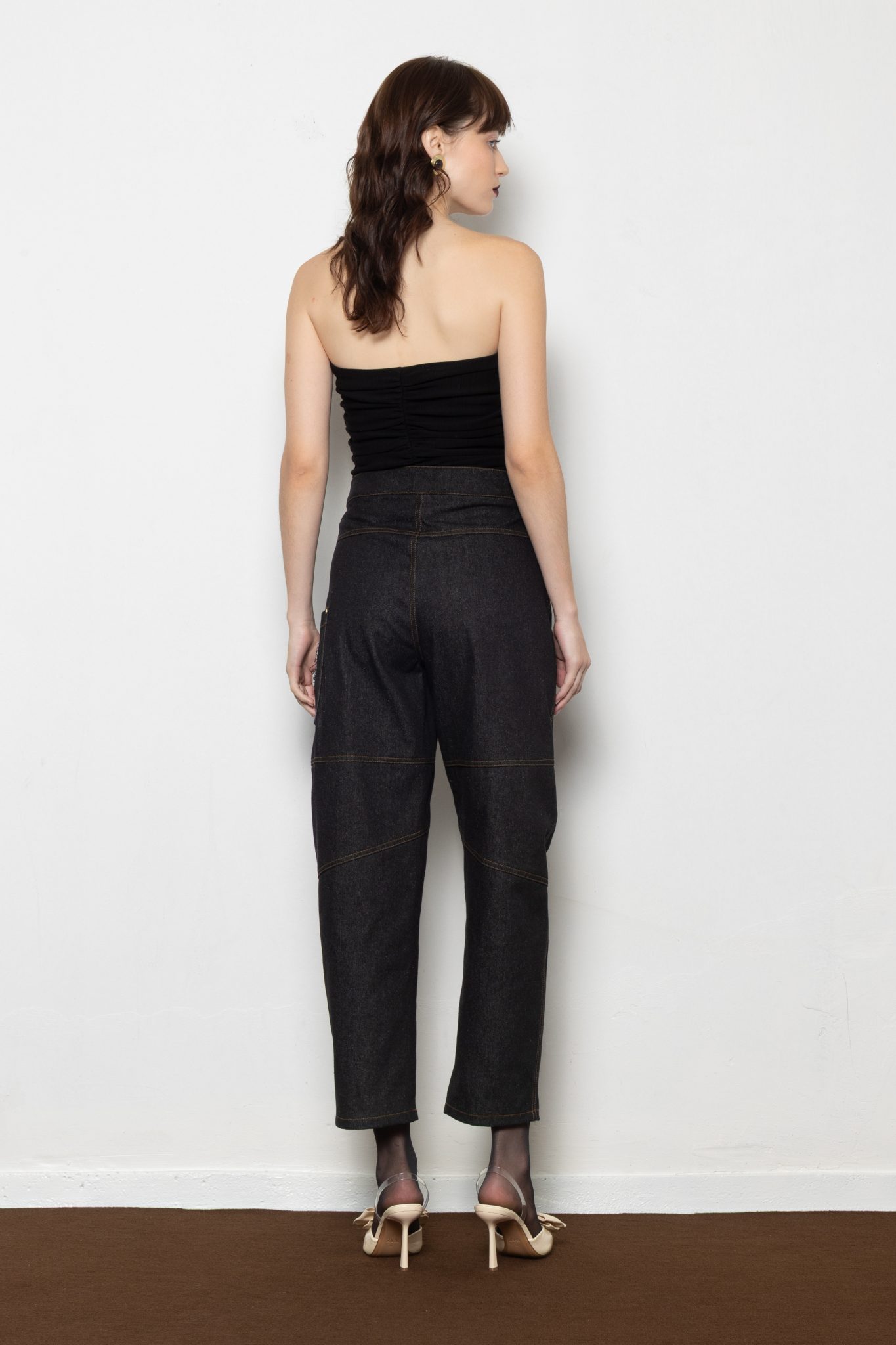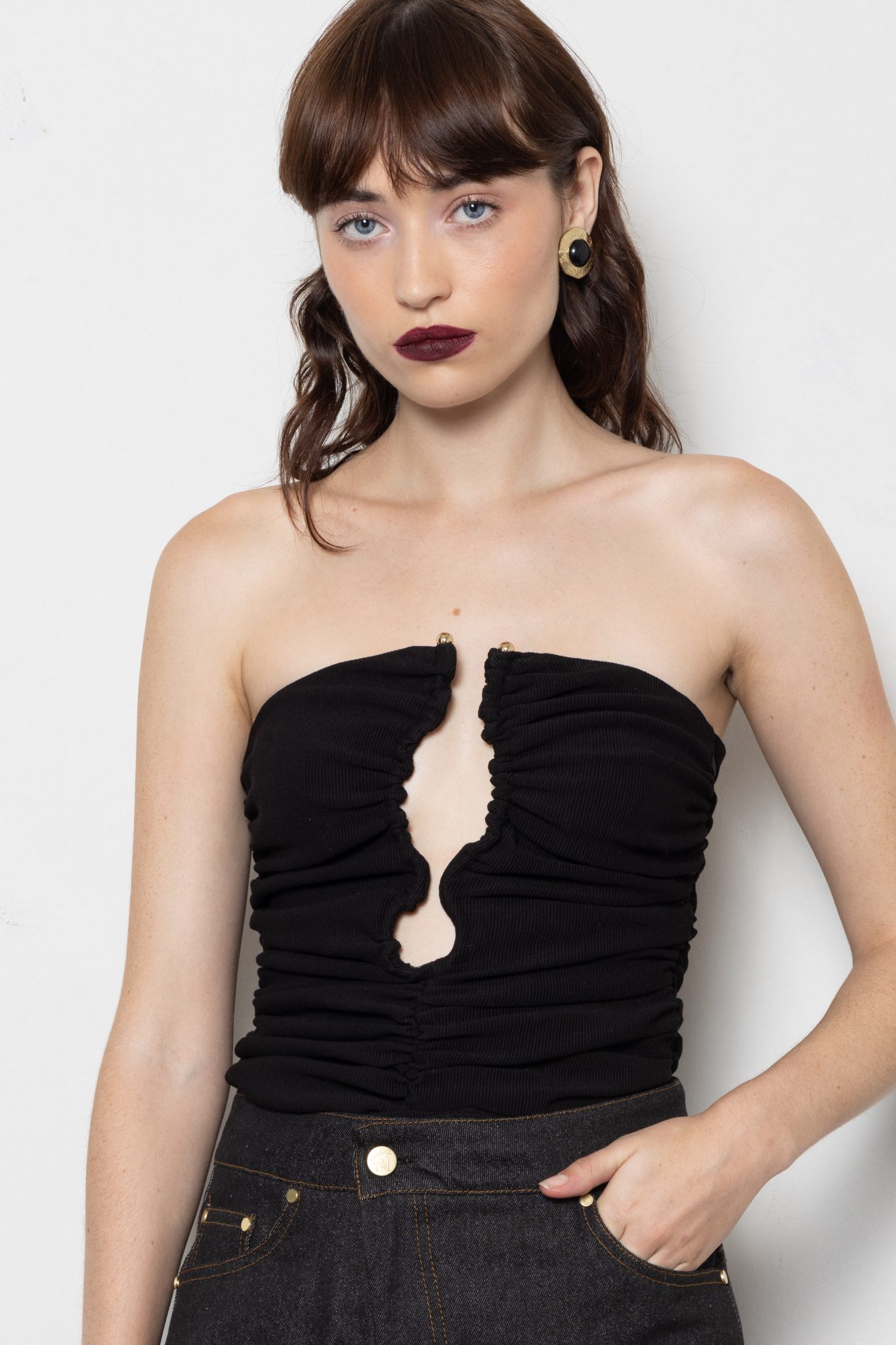 Ruched black Strapless top with sculptural front cutout and gold hook details —sultry, statement-making, and made for after dark.