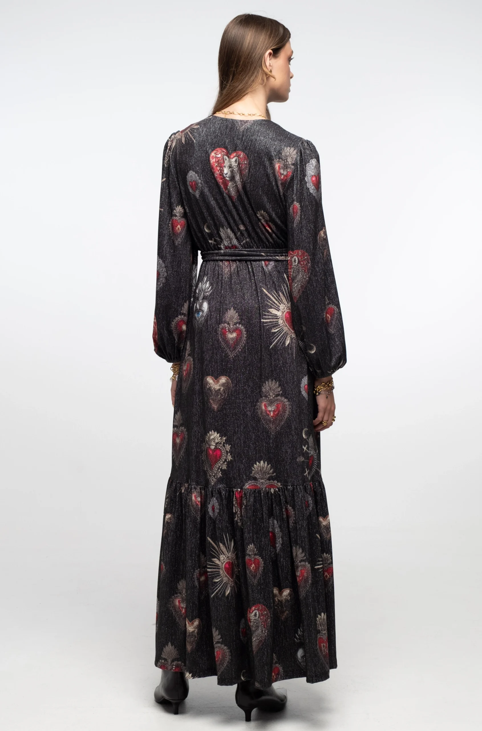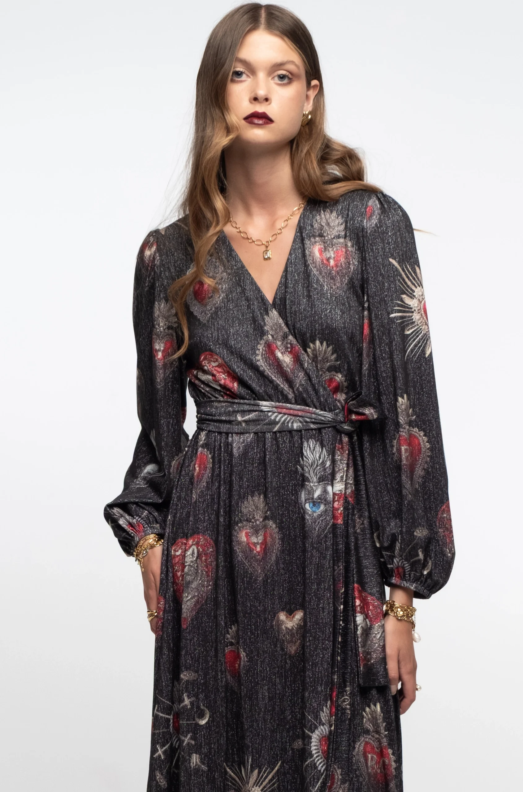 Drawing from myths, dreams and romance, our Elisium Wrap Dress features an enchanting all-over print. Made from lightweight stretch jersey, this long dress has the subtle texture and shimmer of lurex. The deep wrap effect neckline draws in at the belted waist before flowing into single tier, gathered hem skirt. Long, full sleeves finish in elasticated cuffs to complete the boho chic look.