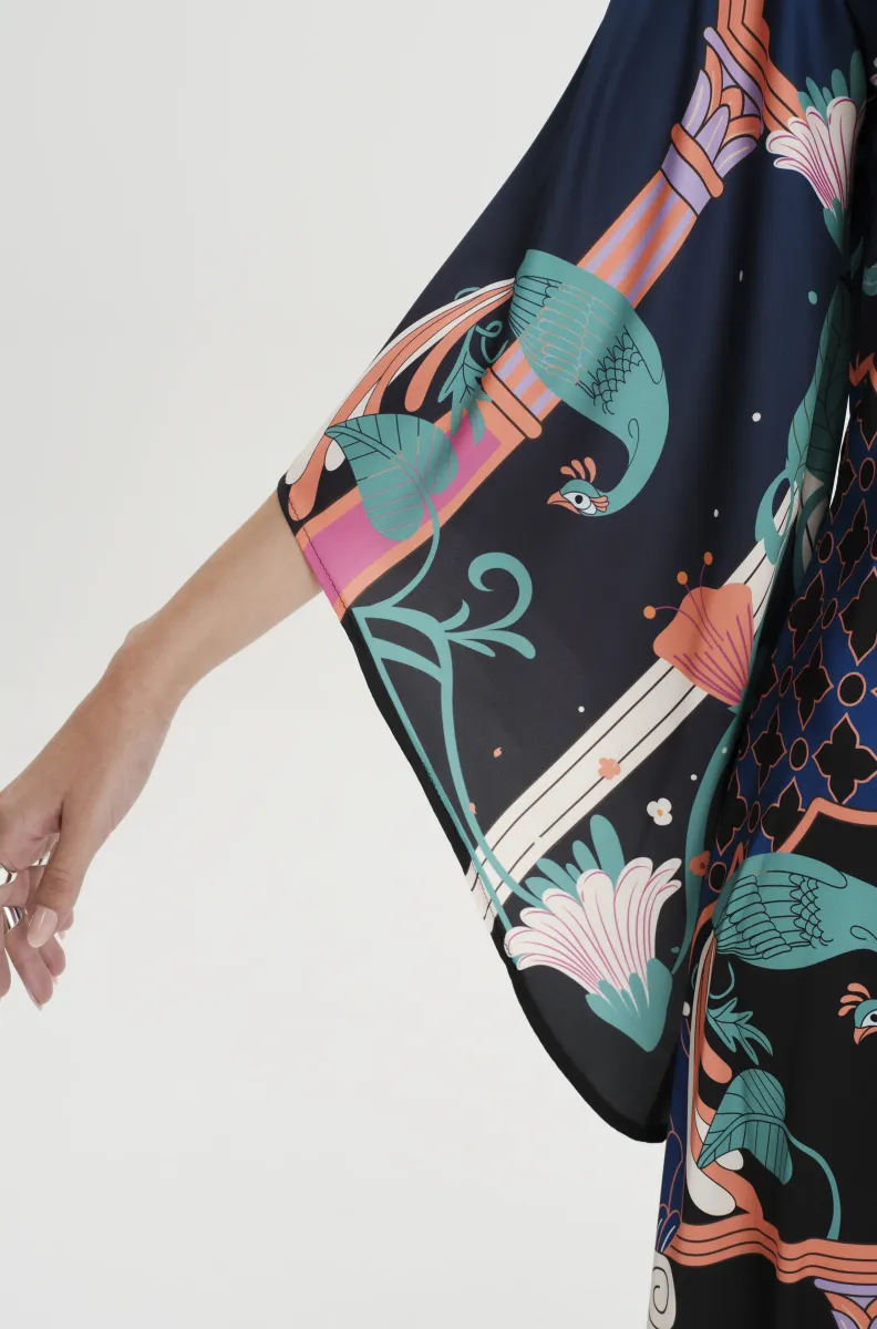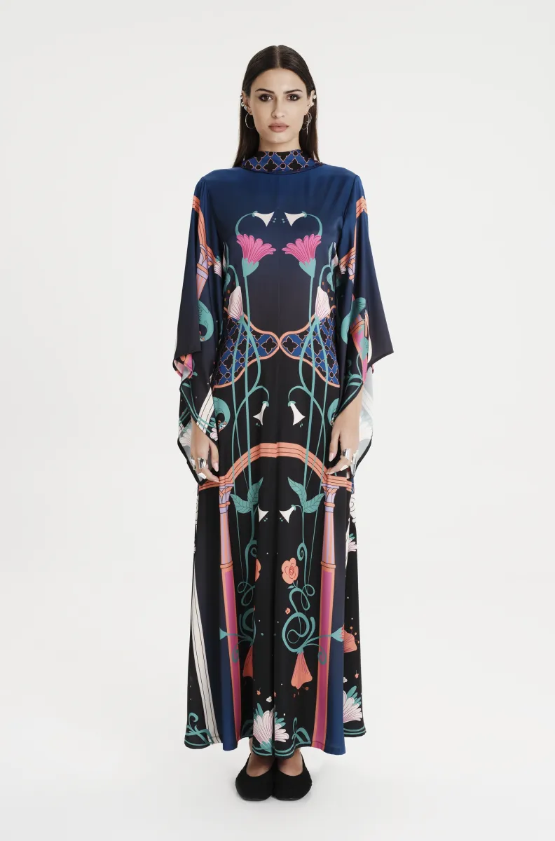 Bring drama and romance to your next occasion with our Epoque Dress. This silky maxi dress can be worn two ways. Choose from a high neck to the front and ribbon tie at the back or V-neck and ribbon tie to the front. This long satin dress has lush angel sleeves and a dynamic Art Nouveau placement print on a subtle ombre background.