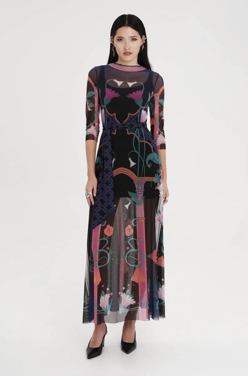 Elongating sleeves and a fitted A-line silhouette give our Epoque Long Dress refined energy. This soft stretch mesh dress has an opaque black jersey slip dress and features a placement print of vibrant Art Nouveau motifs on a subtle ombre background. Its matching belt can be worn for added definition or as a ribbon scarf tied at the neck for added flair.