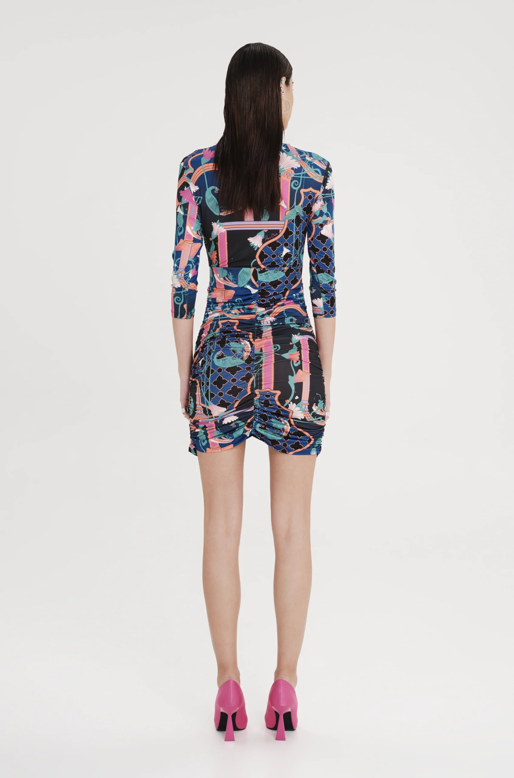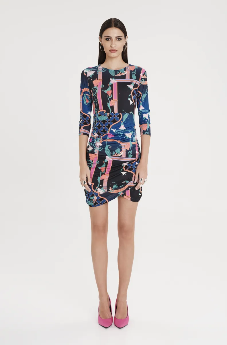 With the romance of Art Nouveau motifs in an all-over print, our Epoque Short Dress has an ultra-feminine silhouette. Its fitted ¾ sleeves balance with the wrap effect mini length skirt. Gather details at the side and back seams create an alluring fit while the smooth stretch jersey and elasticated waist give ease of wear. A flirty dress to wear for nights out.