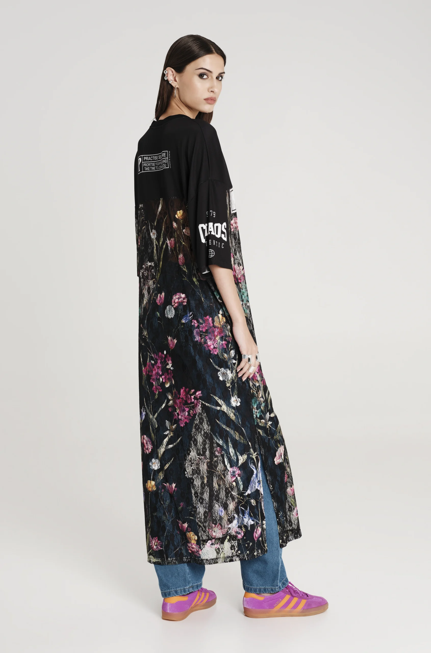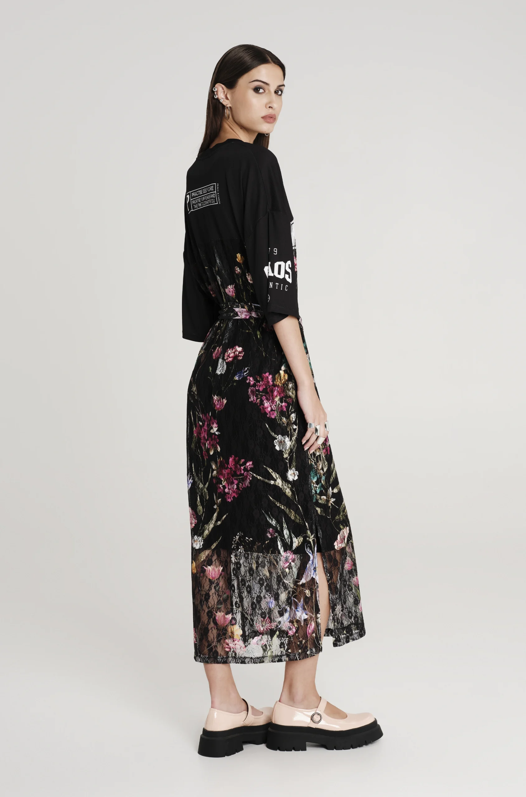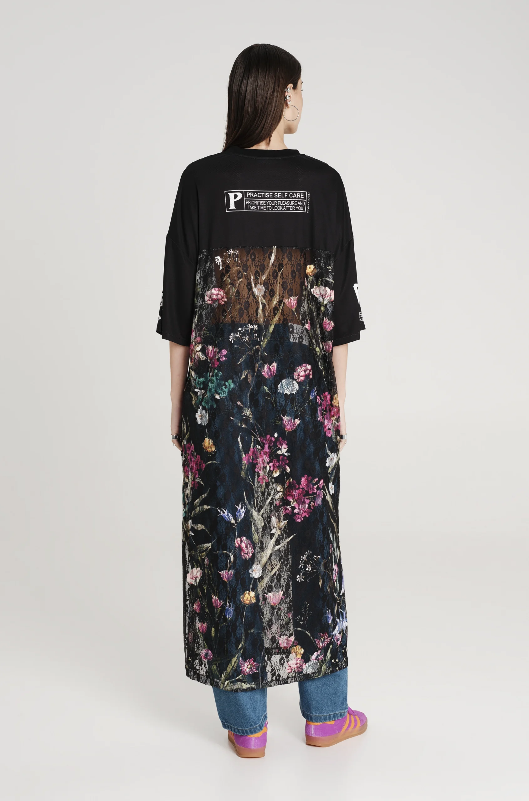 The contrasting elements of our Flowercore Dress work together to combine sporty details with soft lace and florals. Its placement print combines athletic inspired motifs with words of self-care wisdom. The V-neck rib detail and black bird eye mesh panel flows into delicate floral print lace. This sheer dress includes a black opaque jersey slip dress and can be worn loose and flowy or belted and defined.