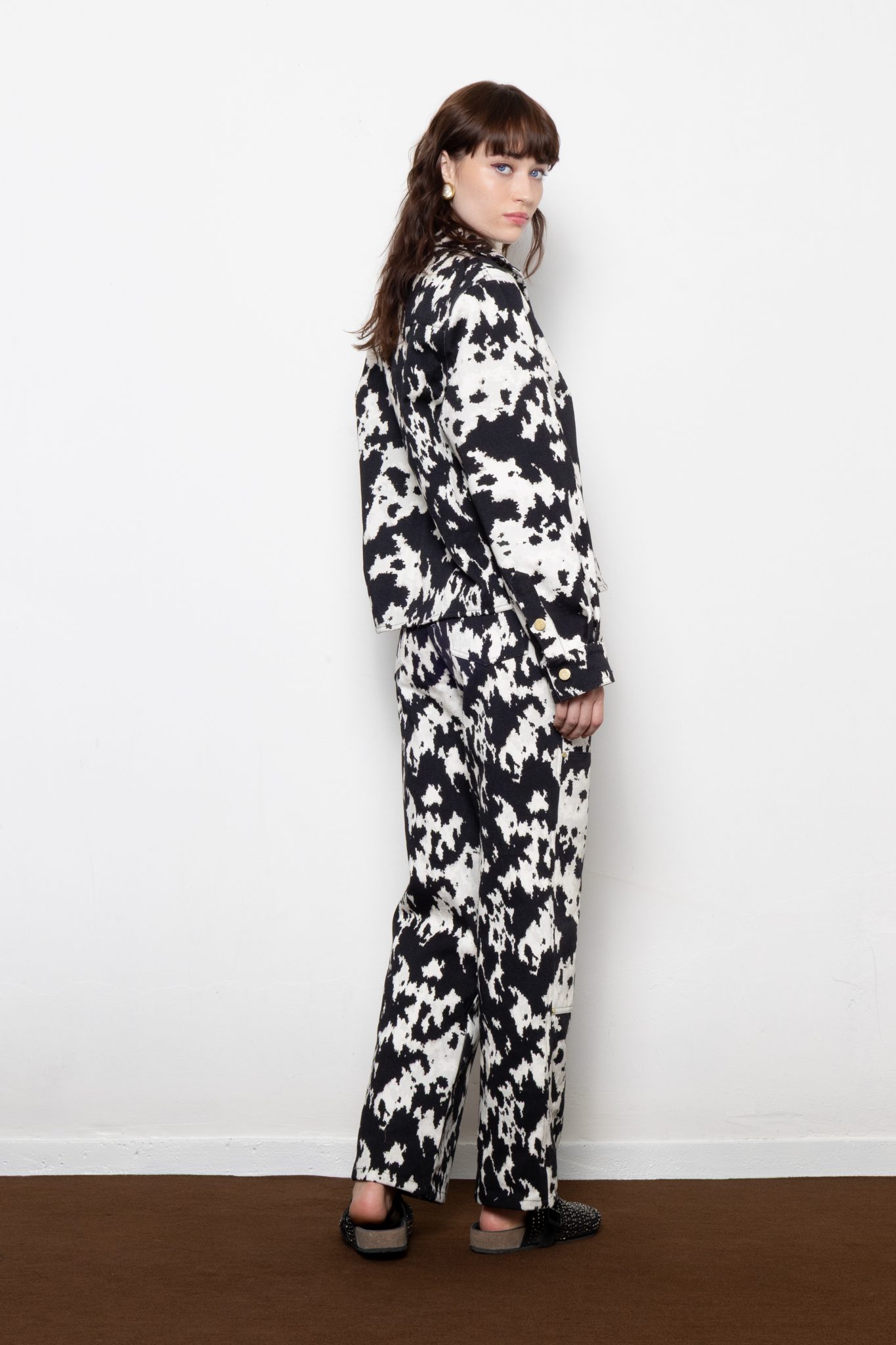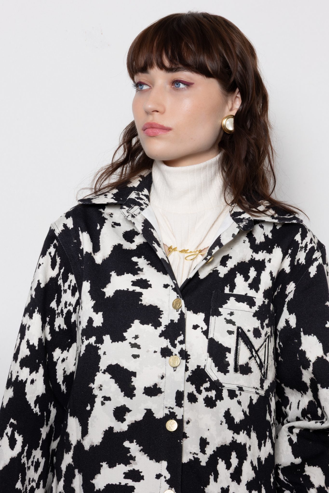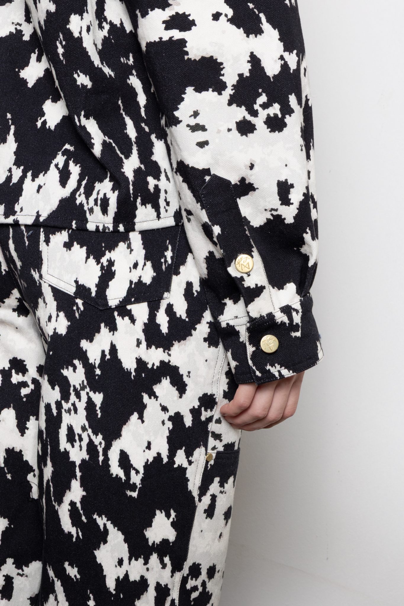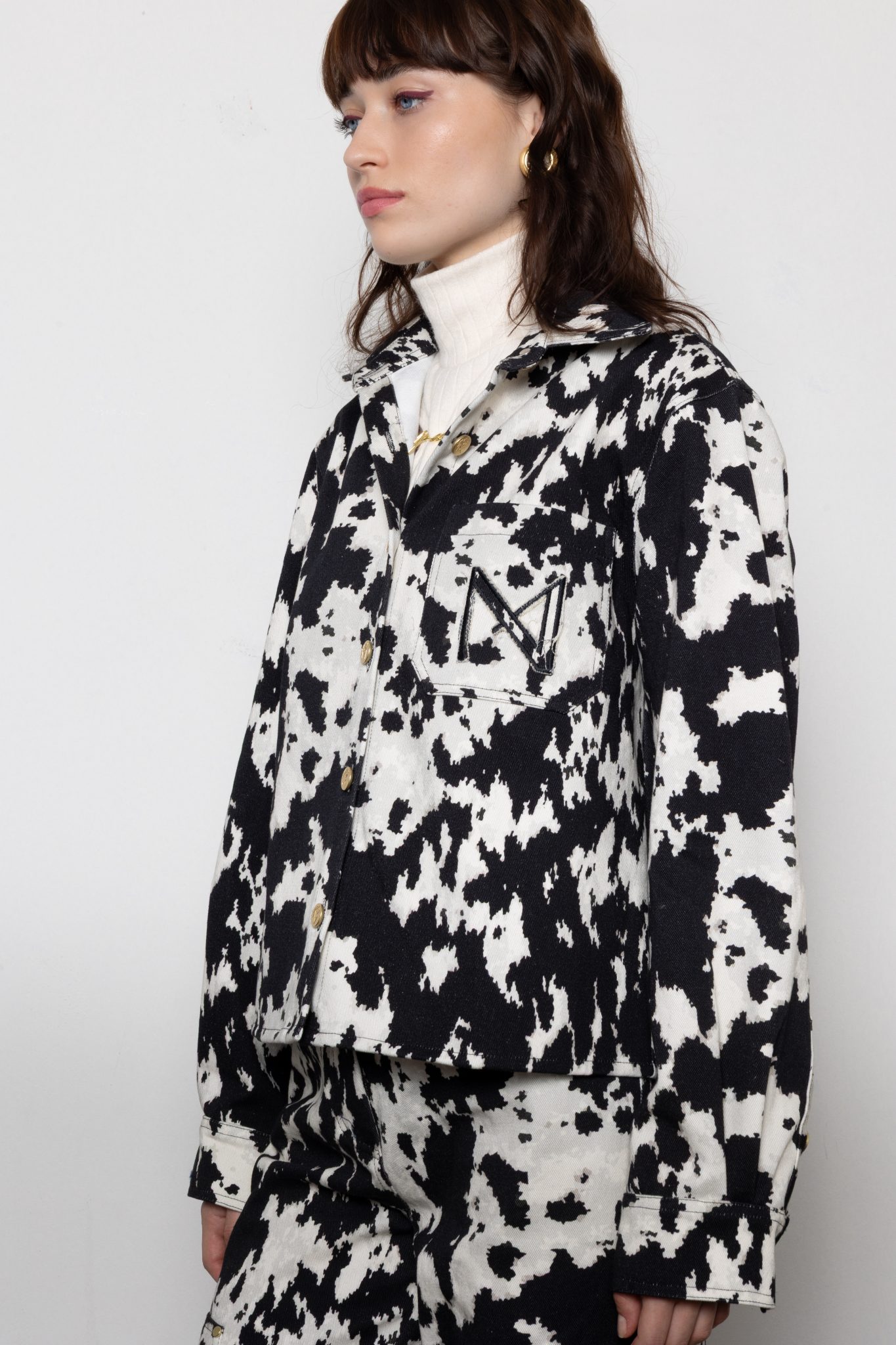 Boxy printed shirt jacket in abstract black and white print with gold buttons and embroidered “M” patch — bold, graphic, and effortlessly standout.