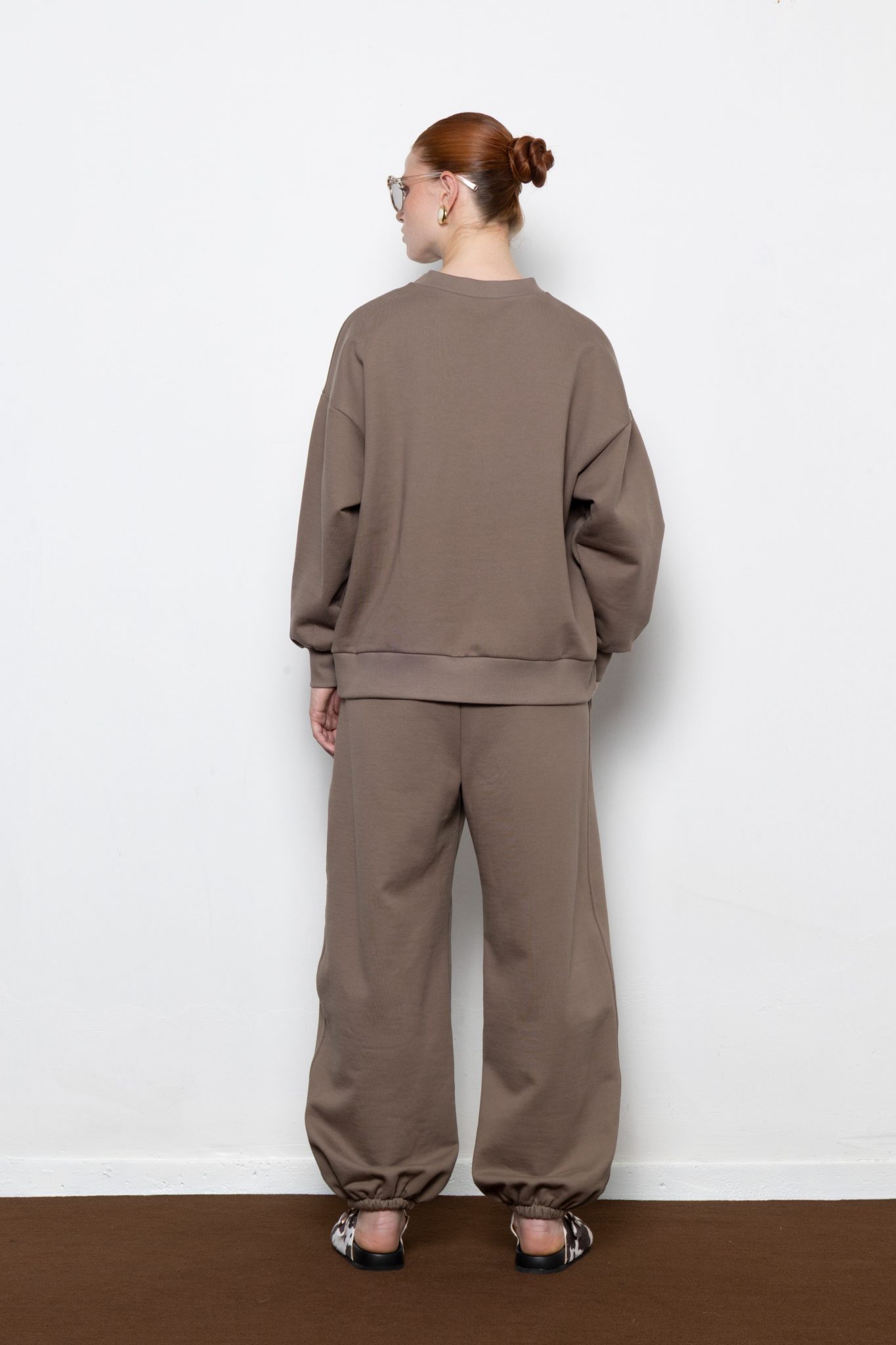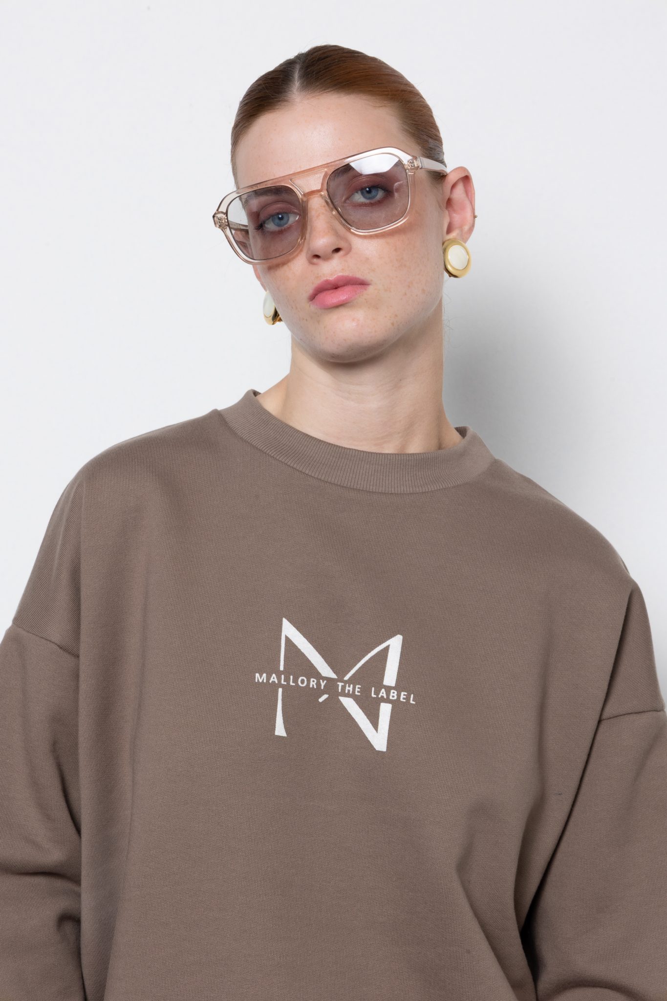 Oversized sweatshirt in washed mocha with signature Mallory monogram —cozy, minimal, and elevated for everyday wear.