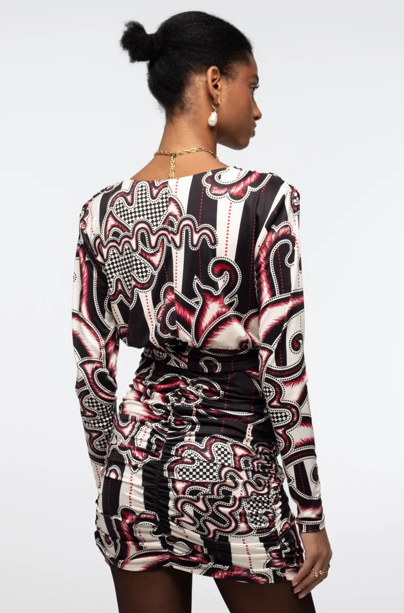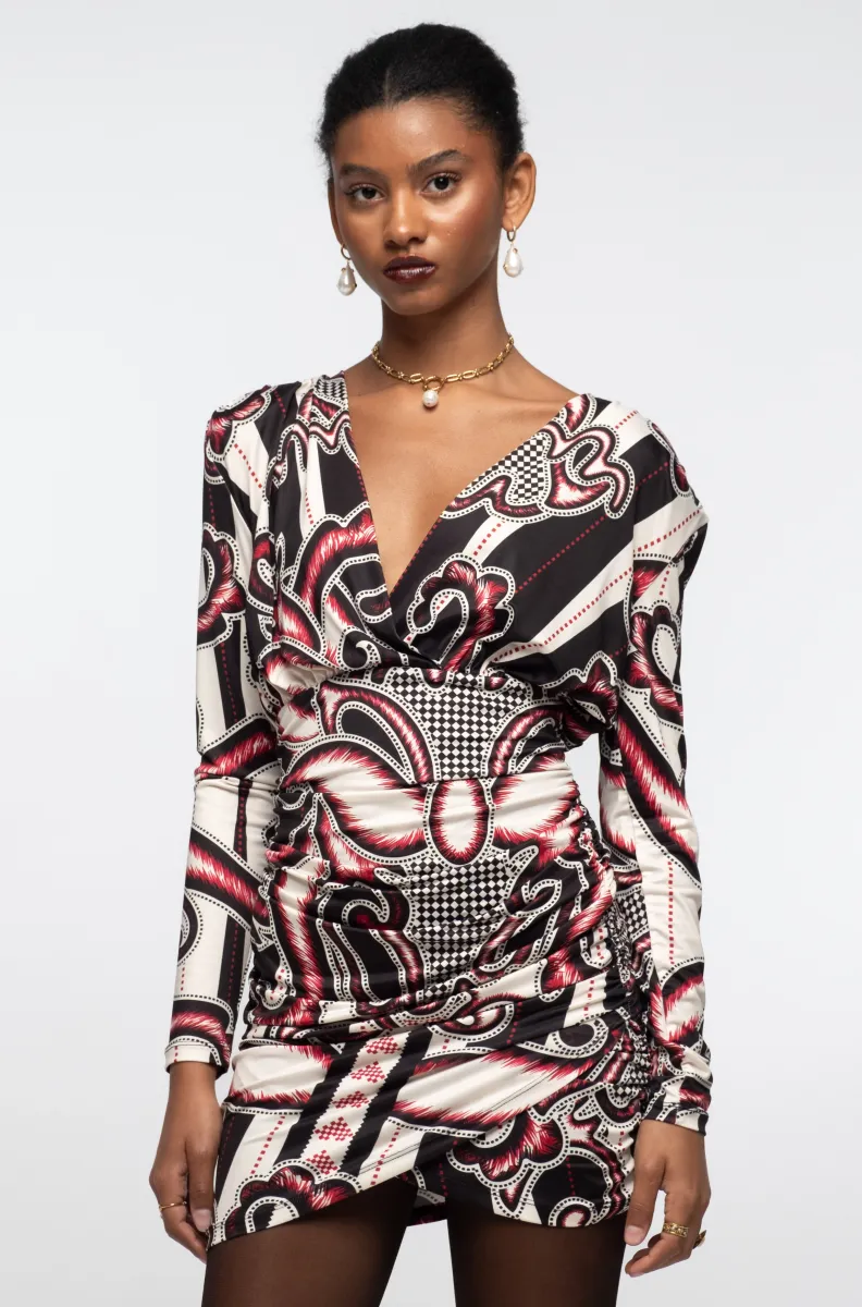 With a bold all-over print in red, black and ecru, our Lyrical Short Dress gives an alluring vibe. Smooth stretch jersey and gather details create a flattering fit while the elasticated waist adds definition. This bodycon mini dress is finished with fitted sleeves and a deep wrap-effect neckline for refined feminine energy.