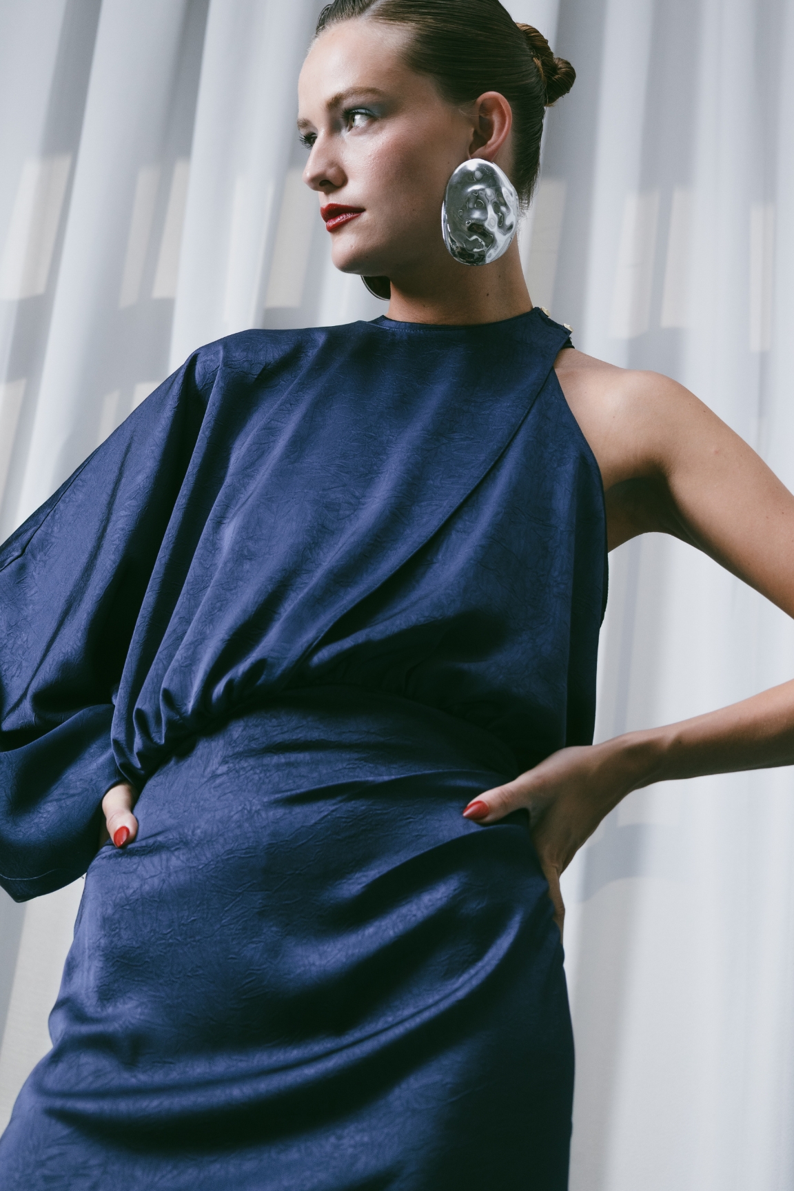 Asymmetric blue with a single voluminous sleeve and high neckline —sculptural, dramatic, and unapologetically bold. A statement silhouette for after-dark elegance.