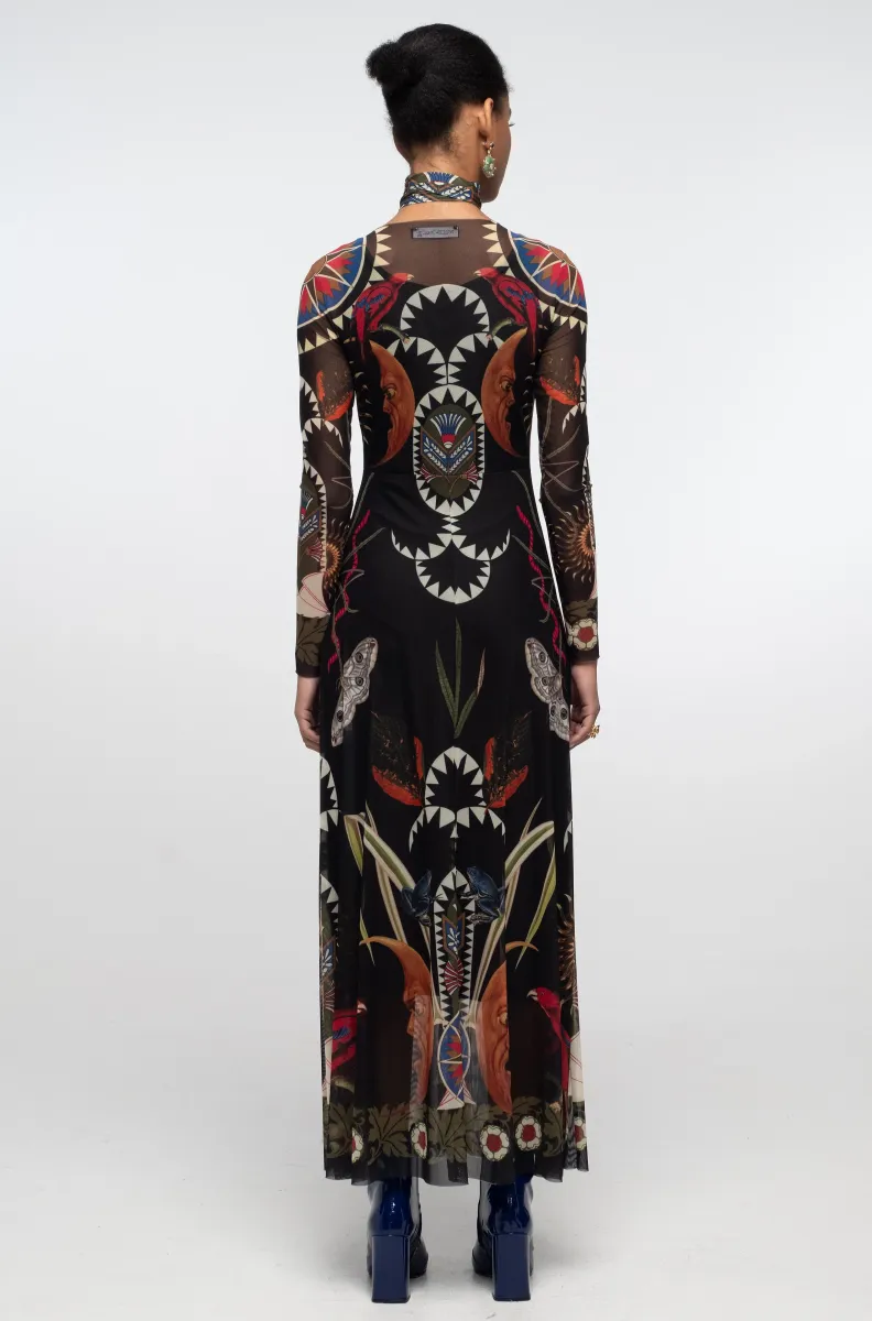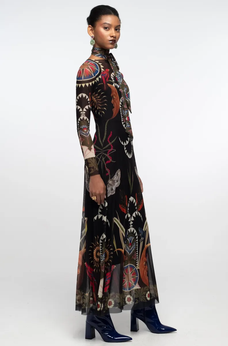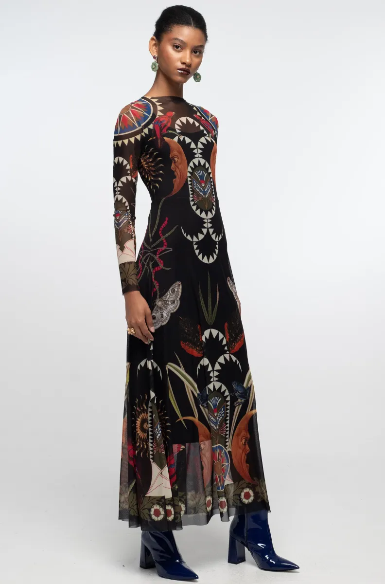 Our Nocturnal Long Dress captures feminine expression’s mysterious side. Botanicals and celestial symbolism spread across black translucent stretch mesh in a combination of dusty jewel tones and aged golds. With long sleeves and an A-line silhouette, this smooth mesh dress falls gracefully over a midi length opaque black slip dress. Its matching belt can be used as a ribbon scarf tied at the neck for added embellishment. Discover the exceptional print of this item, crafted using the placement technique. Each part of the garment features a unique print, and when combined, they create a true masterpiece.