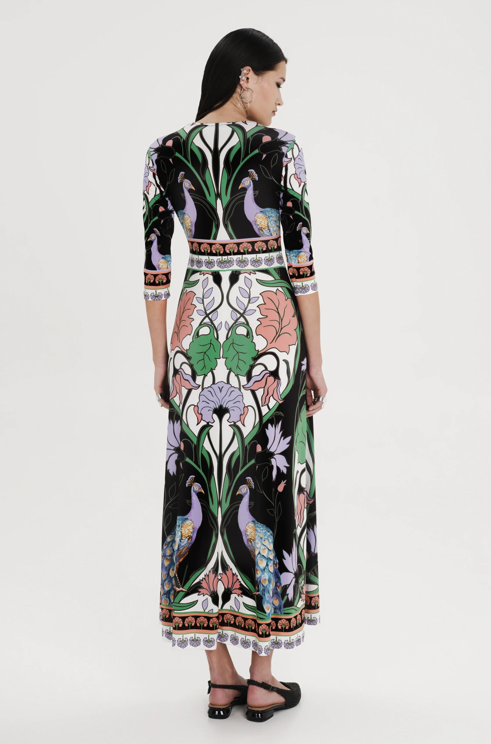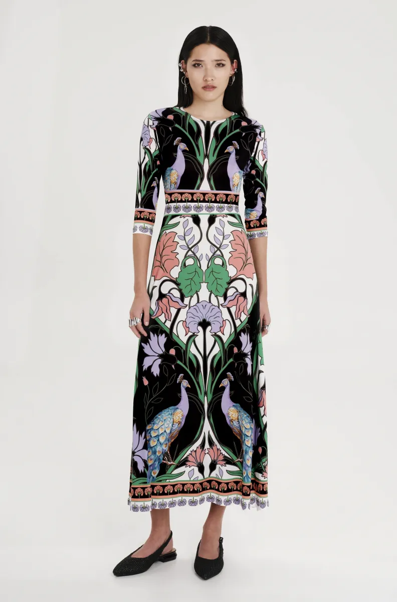 With a signature P+C silhouette in smooth stretch jersey, our Nostalgia Maxi Dress is fitted at the waist and flows into an A-line skirt. This ¾ sleeve, long dress features a figure flattering placement print with symbolic peacocks and the colour palette of paradise birds. Wear it to daytime events, summer evenings, or whenever you want to let your true self shine.