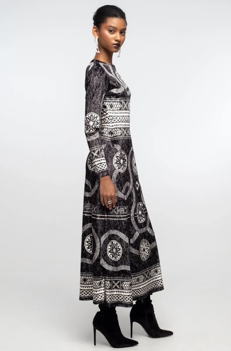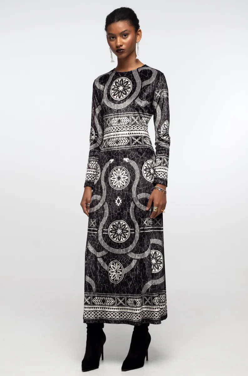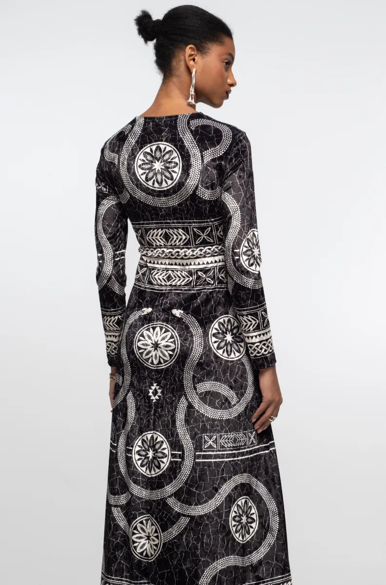Using a monochromatic placement print on shimmering ice velvet, our Philosophy Long Dress features mystical serpent motifs, mandalas and a crackle effect background. The hem and waist details echo traditional woven, folk textile art while the long sleeves enhance the feminine A-line silhouette.