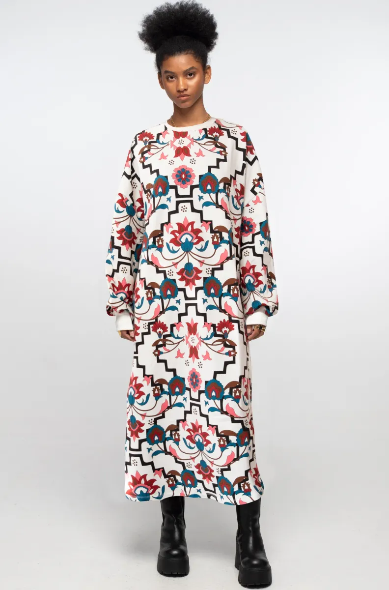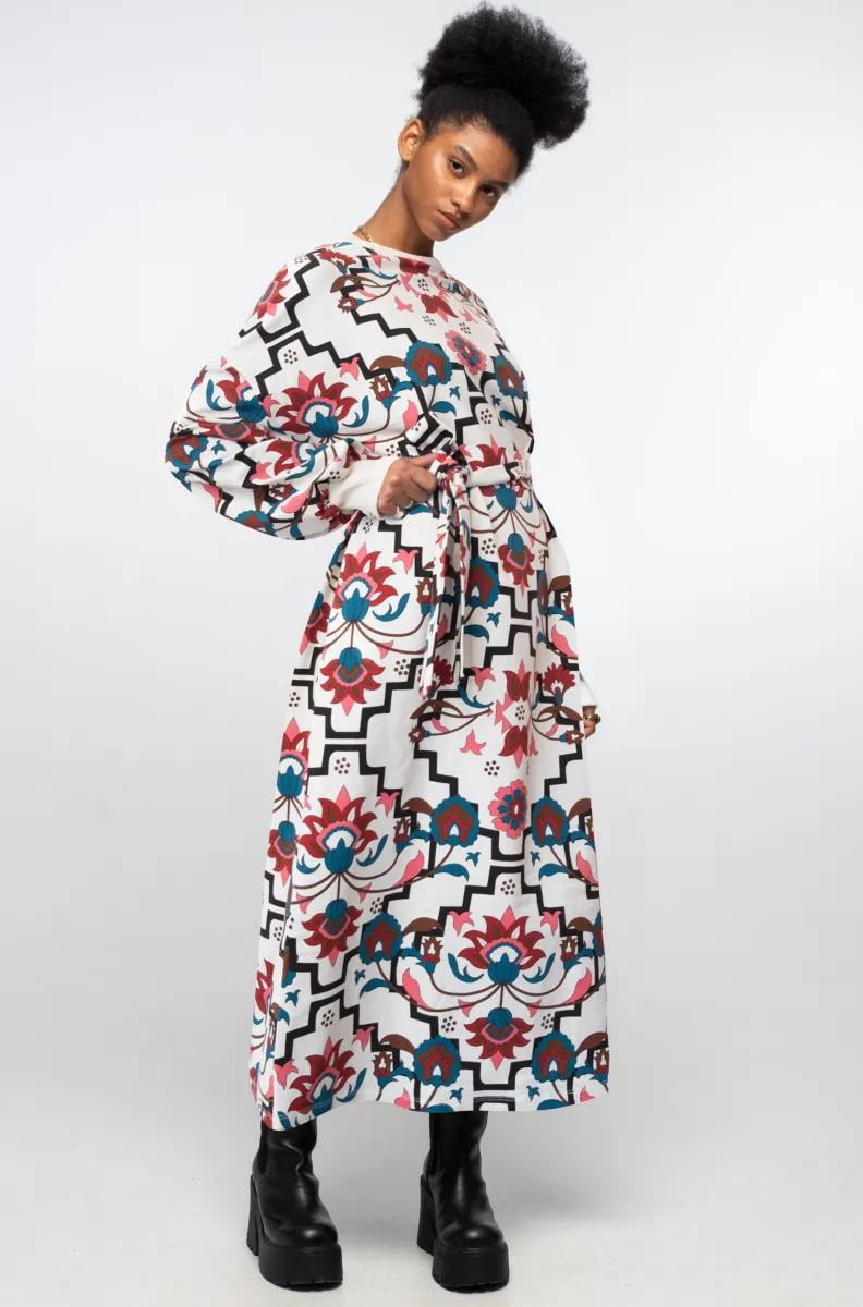Our Romancer Long Dress features a colourful geometrical floral all-over print on black. Shoulder pads with pleat details sit atop long, puff sleeves that finish with elasticated cuffs. The invisible zip at the back allows for a smooth fit. Wear this A-line dress with its matching belt to define your waist.