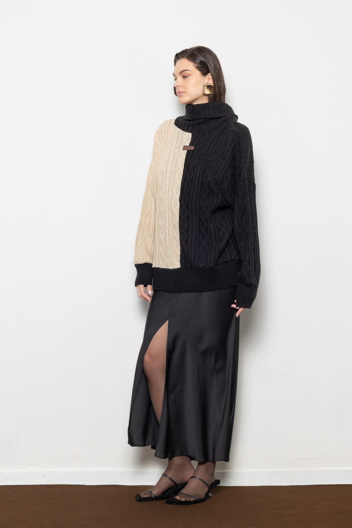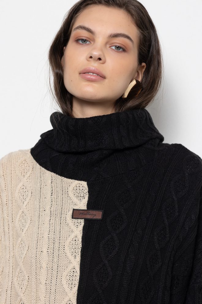 Two-tone cable knit turtleneck sweater in beige and black —b old, cozy, and effortlessly statement-making.