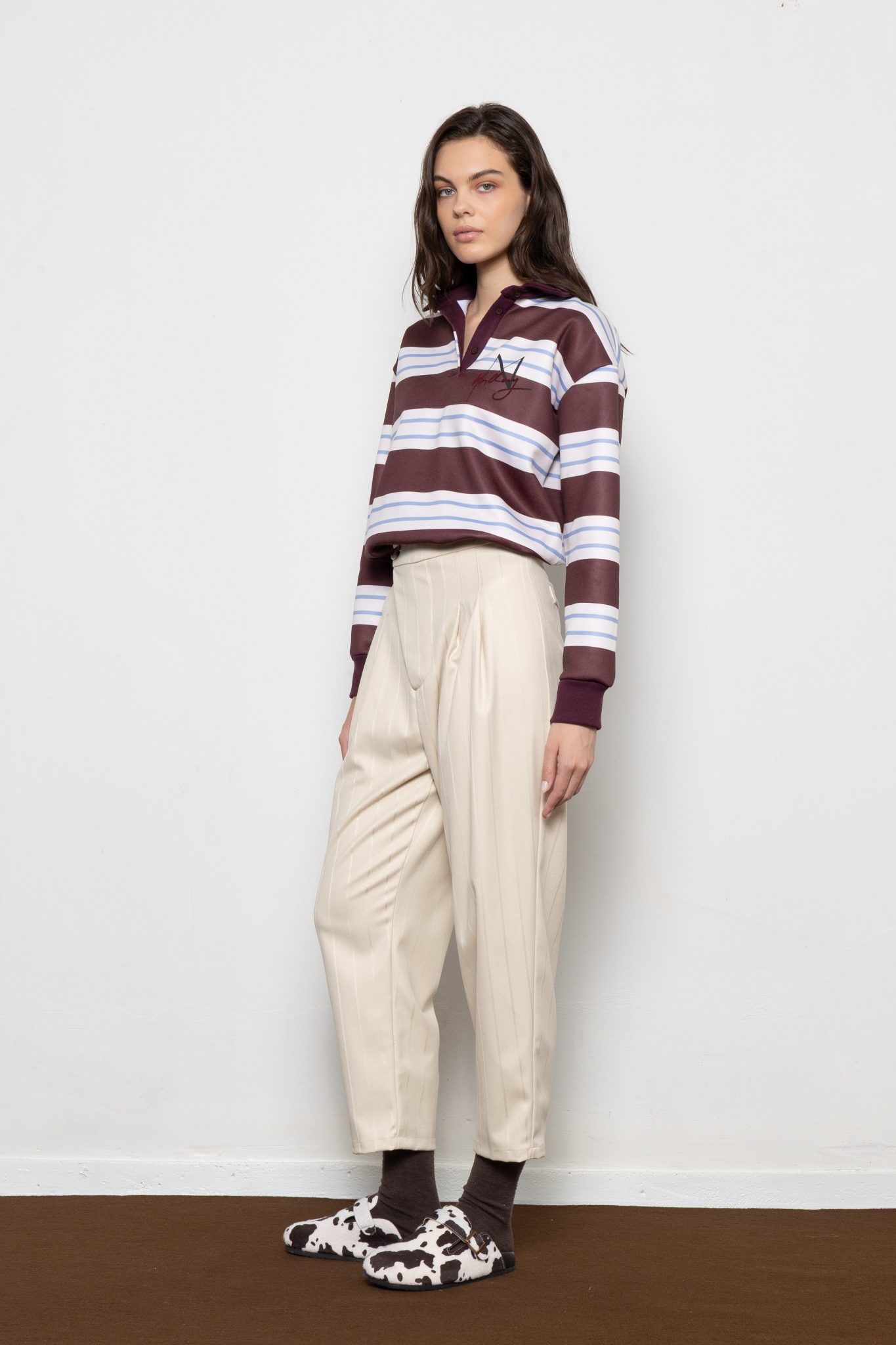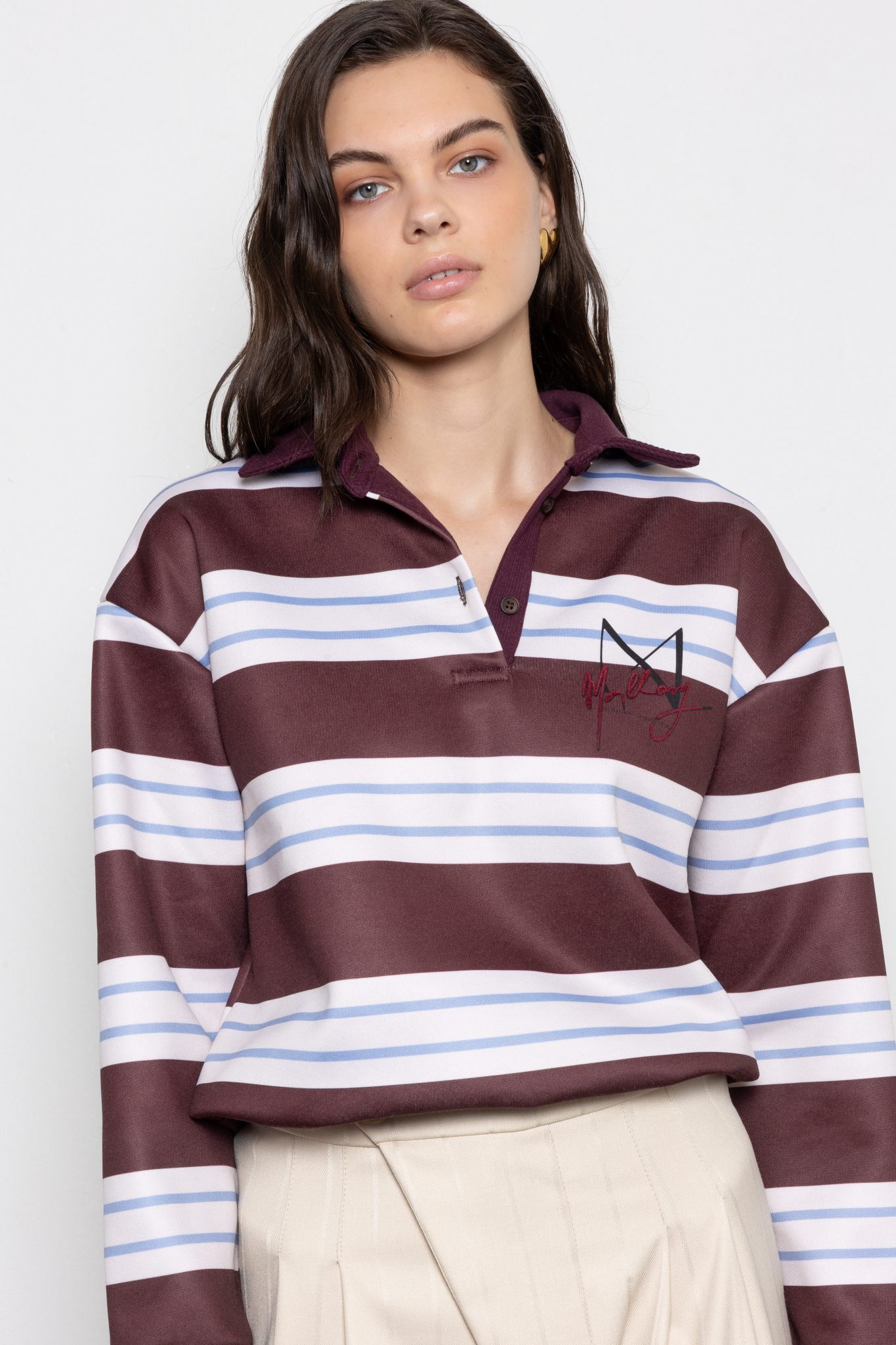 Striped rugby polo in black, white, and yellow with embroidered logo detail —sporty, preppy, and playfully polished.
