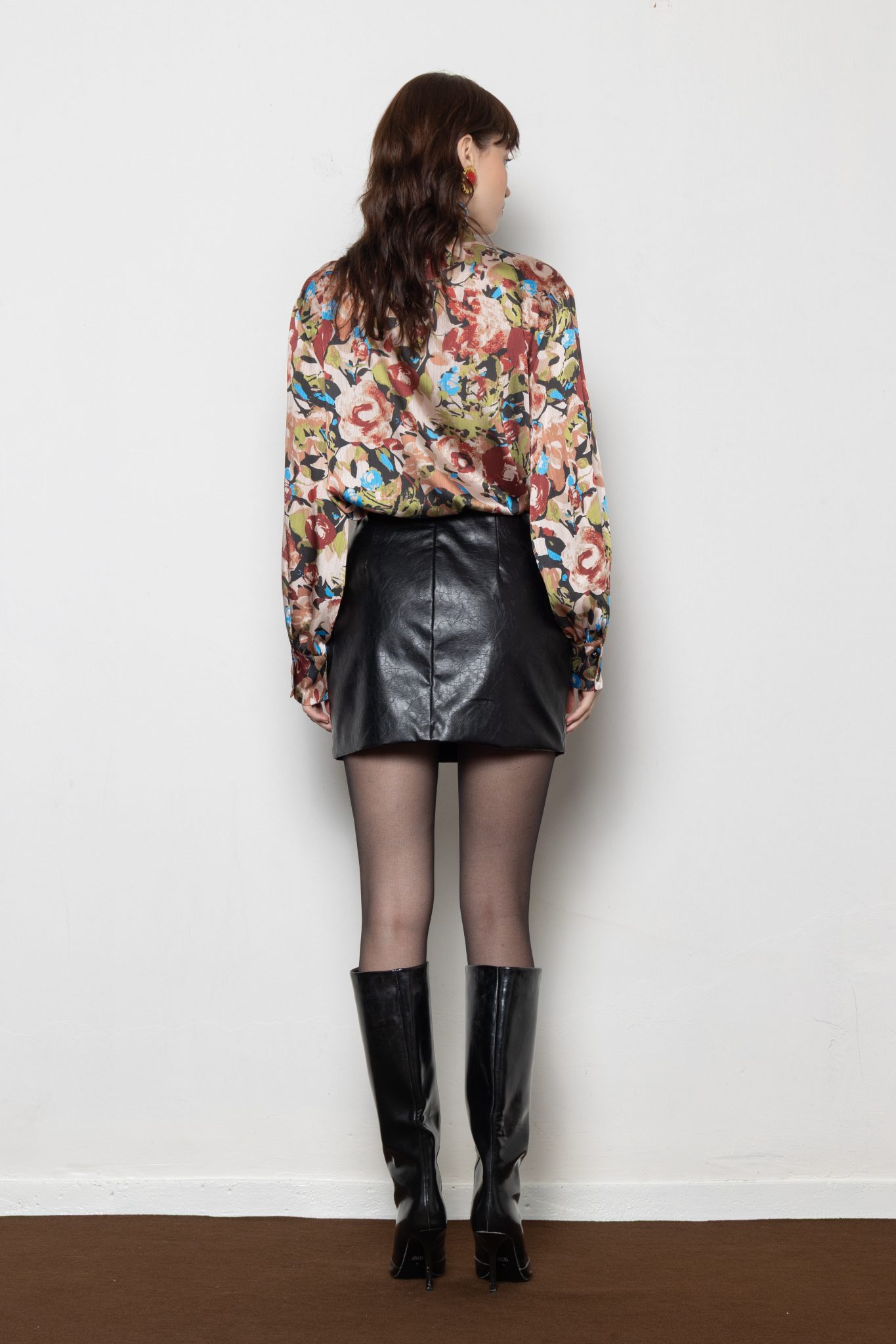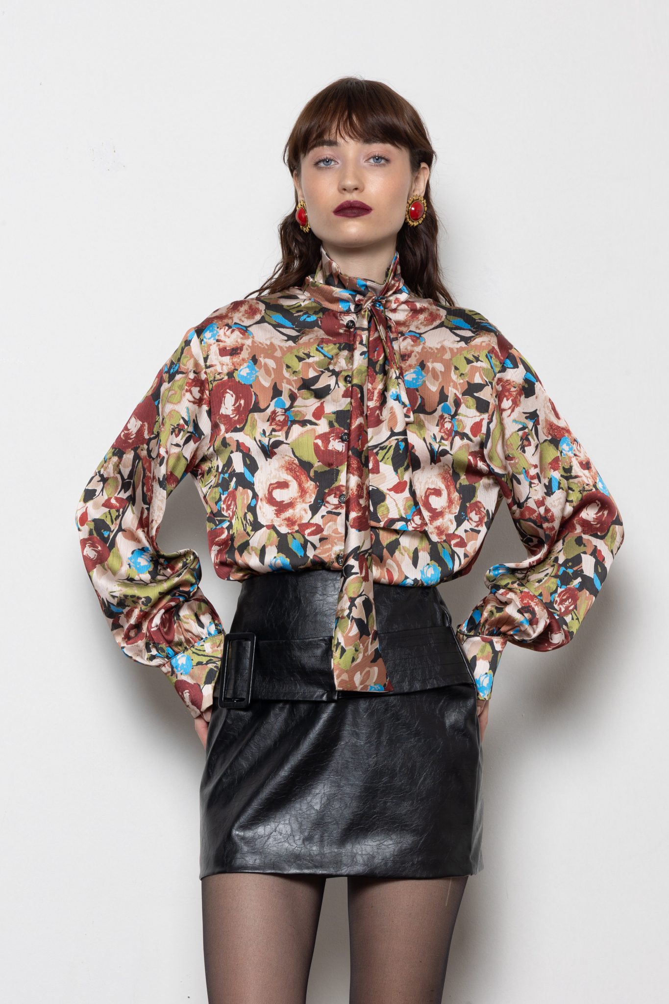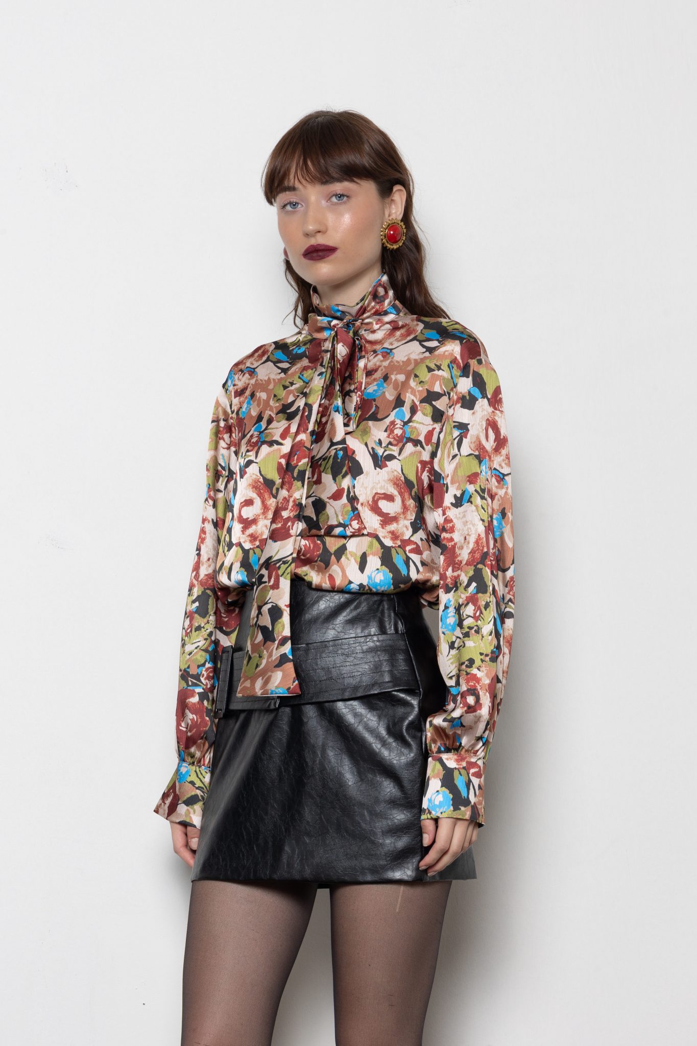 Silky satin floral blouse with a high neck and elegant pussy-bow tie —timeless, feminine, and effortlessly refined.