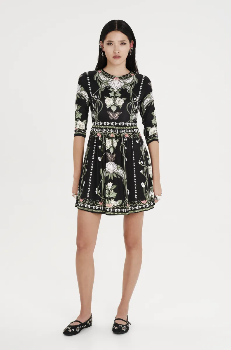 Blending softness, strength, and romance, our Wildflowers Short Dress has a placement print of Art Nouveau floral motifs on a black background of smooth stretch jersey. Fitted through the waist, this short dress flares into a flattering A-line mini skirt while the ¾ sleeves are fitted. Wear for spring daytime occasions or evening moments.